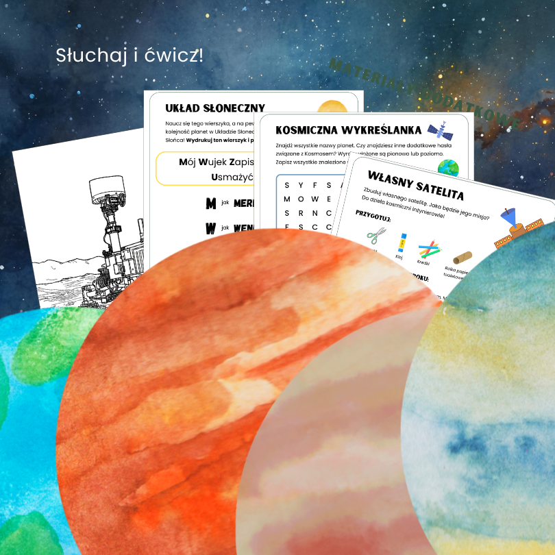 Darmowe "Karty pracy - KOSMOS" to kontynuacja kosmicznej podróży dla naukowego minicyklu audiobajek o kosmosie w ramach podcastu "Julek i Filip w świecie przyrody". Niniejszy zestaw został stworzony w celu ćwiczenia grafomotoryki, umiejętności analitycznych i kreatywności w pasjonującej tematyce kosmicznej. Co zawiera bezpłatny zestaw Karty pracy - KOSMOS?